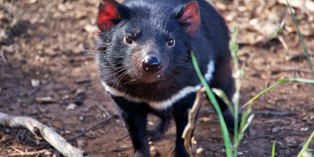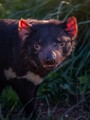 As the world’s largest surviving carnivorous marsupial, the Tassie Devil has a compact, muscular build, a broad head, and a short, powerful tail. Their black fur is often marked with distinctive white patches on the chest, flanks, or rump — though some are pure black. Males can weigh up to 14 kilograms and stand about 30 centimetres tall at the shoulder.