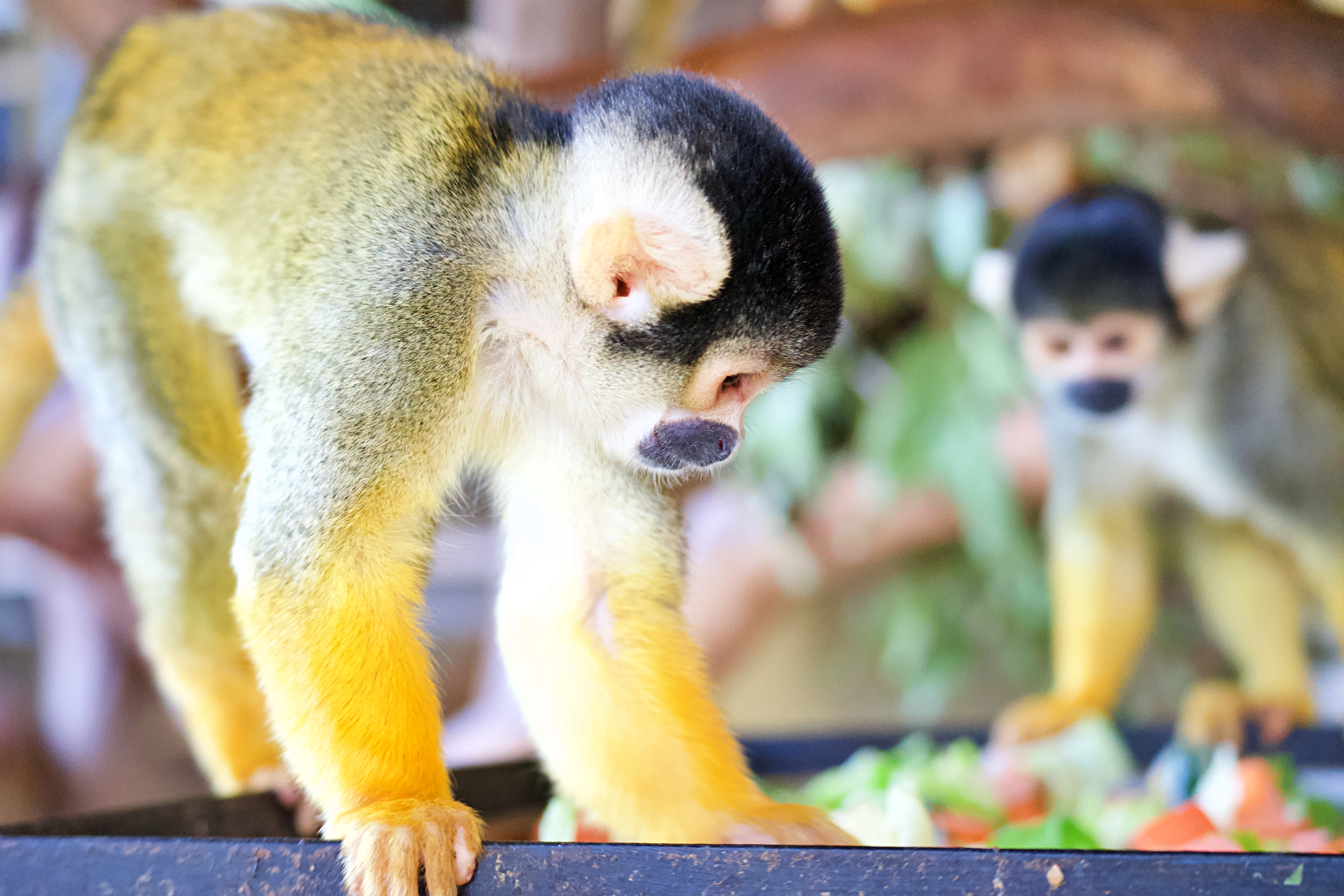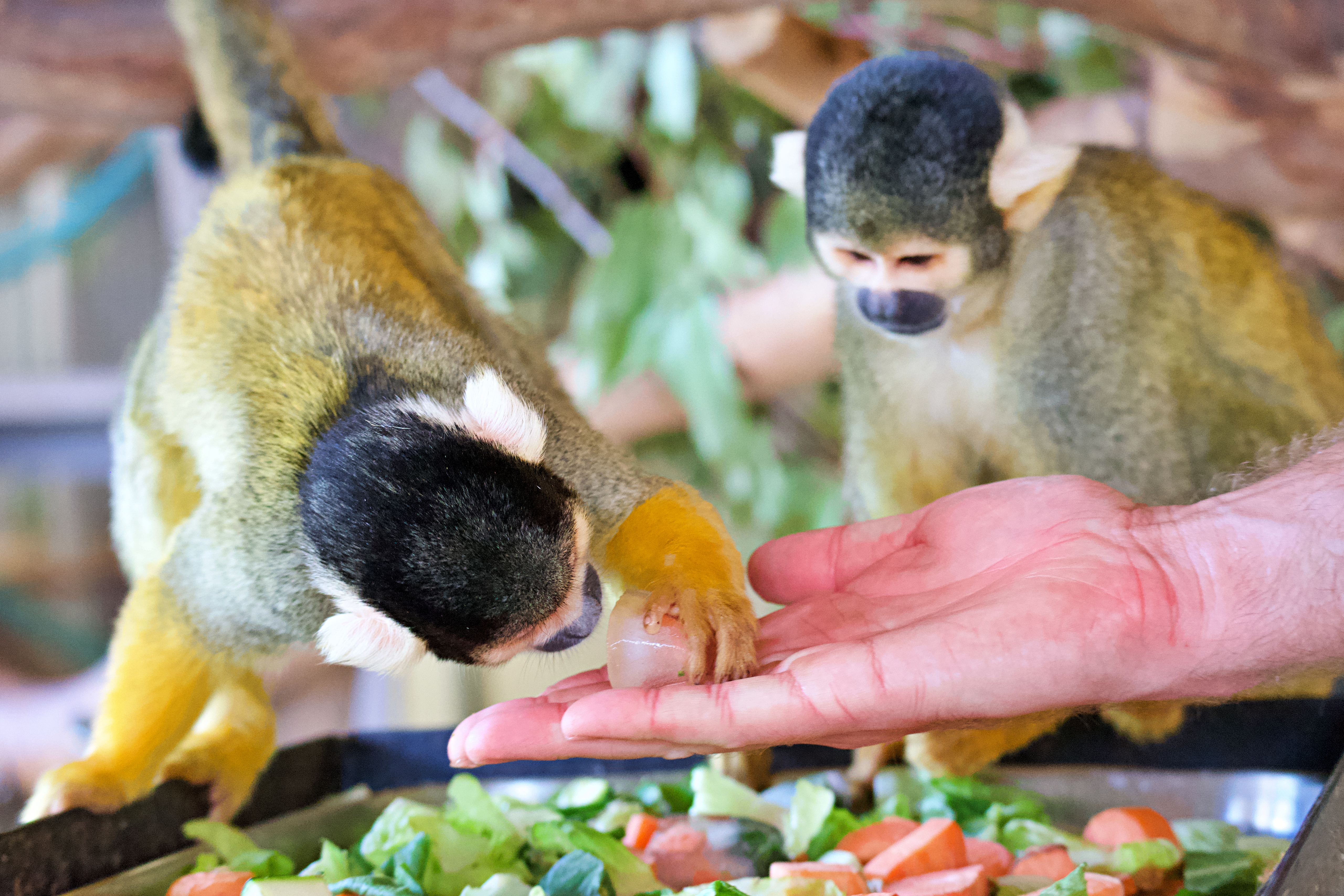 Squirrel monkeys enjoy a diet of fresh fruit, vegetables, insects, and eggs, delivered in puzzle feeders and hidden treats that keep them mentally stimulated. -